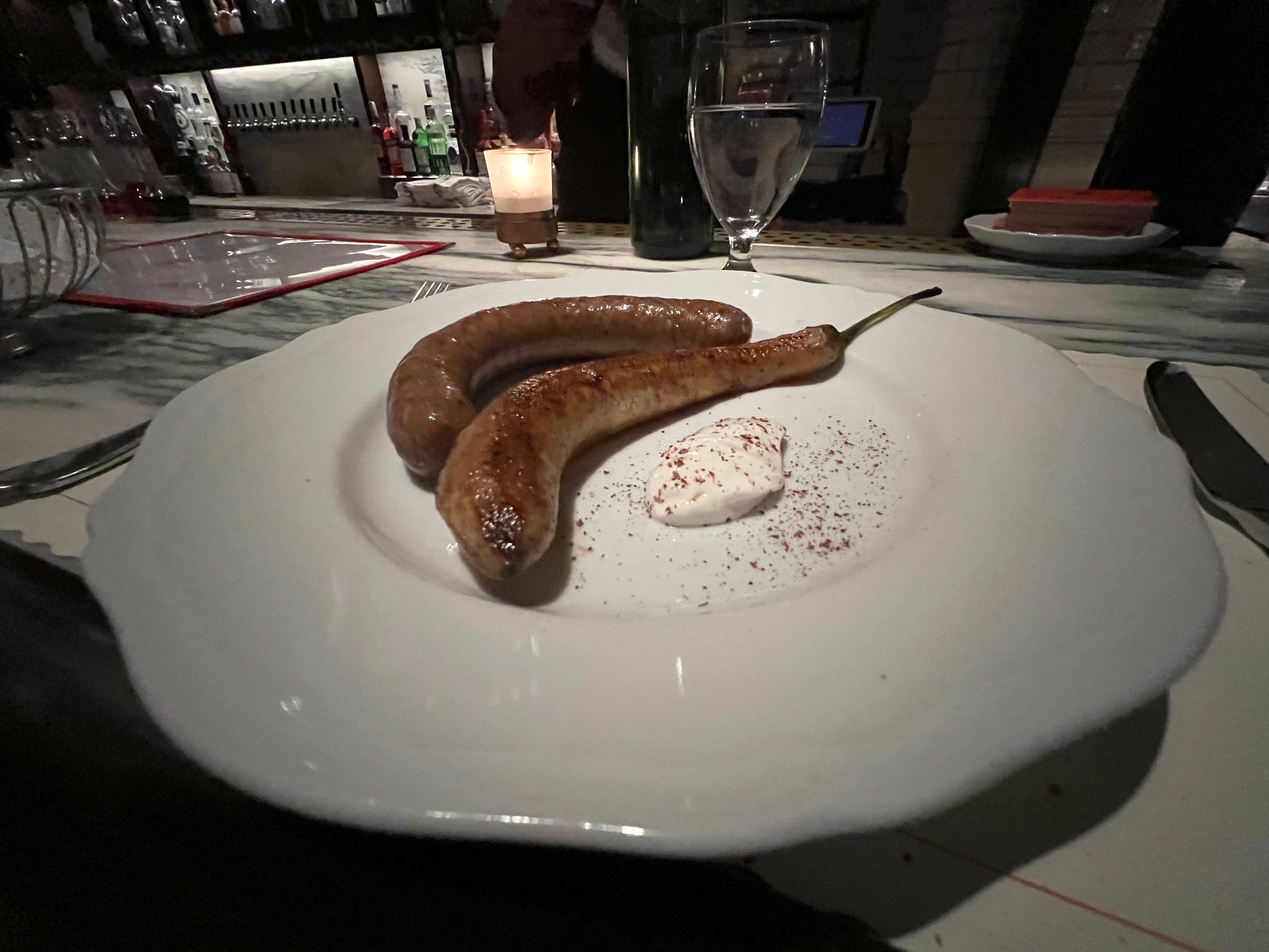 The dish in question is lamb merguez with eggplant. It’s a newcomer to the menu, and it’s a pairing about as predictable as a hot dog with mustard. Yet ten minutes later, I’m staring at two sausages on a white dish. And I’m trying to find the eggplant. In fact I almost raised my hand to inform someone that the kitchen forgot my vegetable.