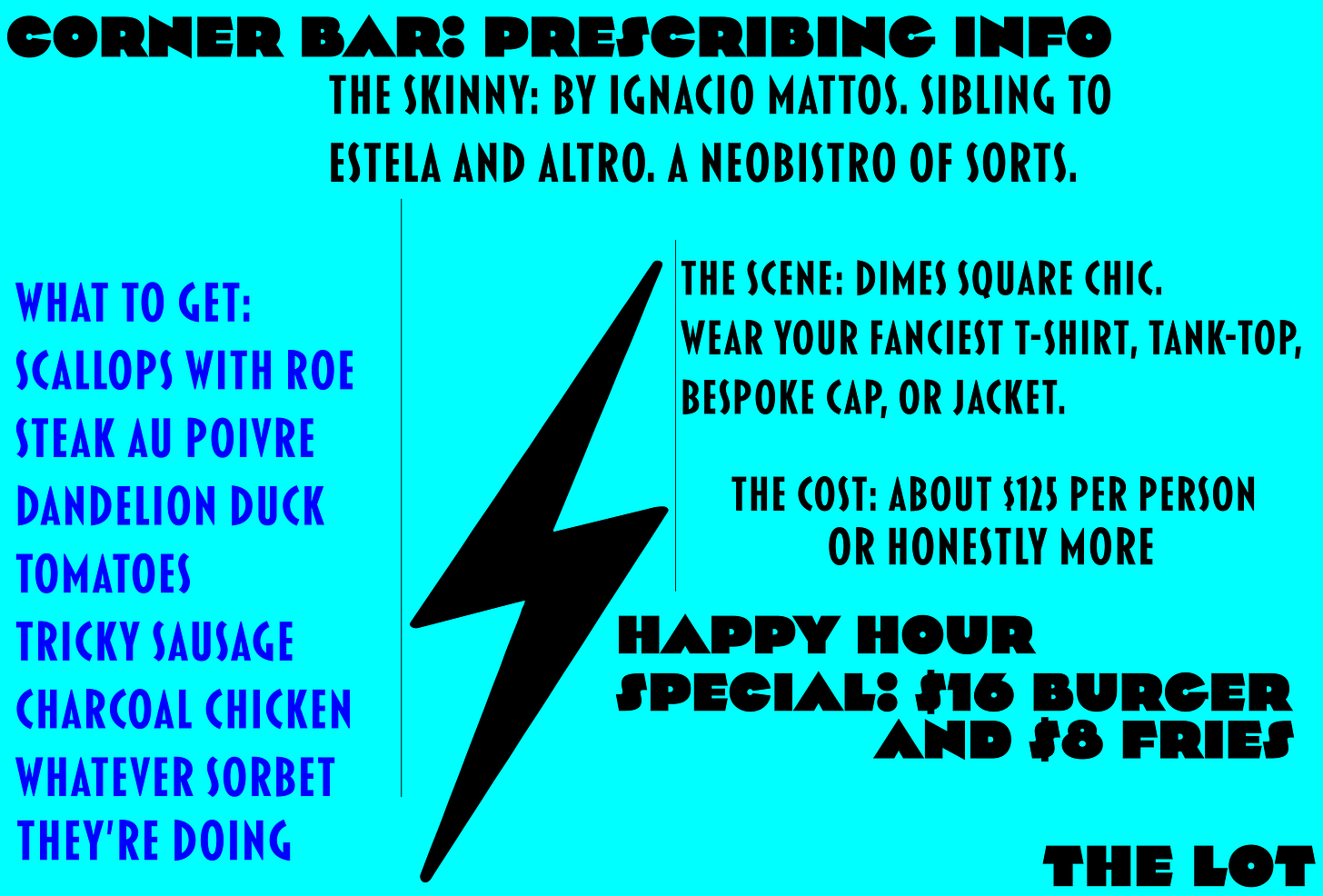 Corner Bar was one of my last long form reviews for Eater NY. I’m still proud of that column. But since there’ve been so many changes at the Dimes Square hotspot, I figured now is the right time for one of my first long reviews here at The LO Times.