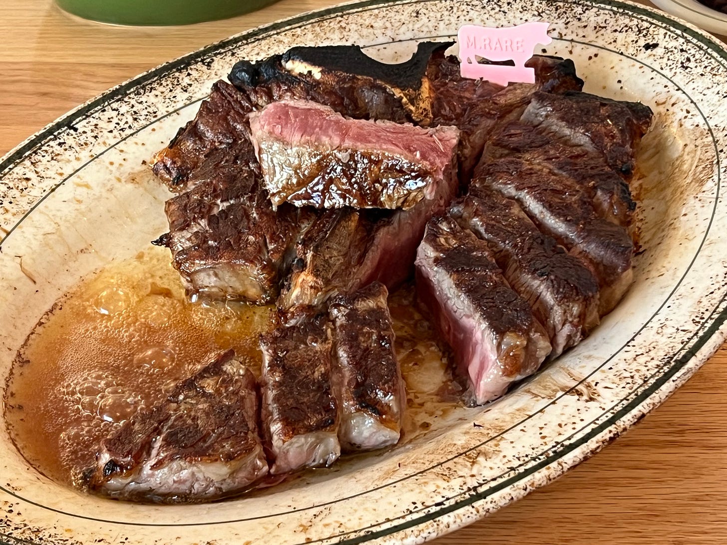 I’ve been reviewing restaurants for twenty years, and I don’t remember the last time a cote de boeuf wowed me in a way that a great ribeye didn’t. There’s little a porterhouse is capable of that a bone-in strip couldn’t do more nimbly.