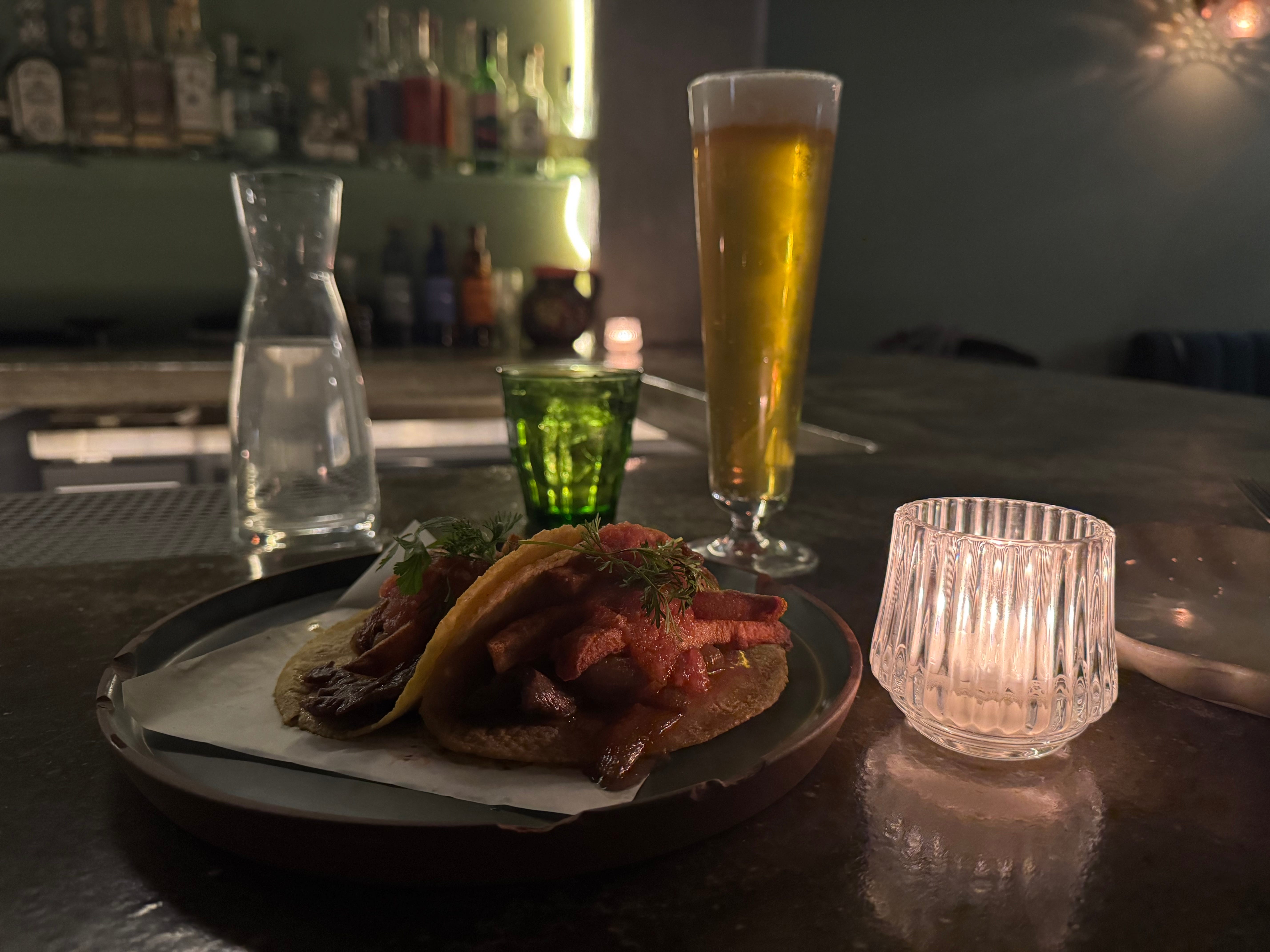 I dropped by for the steak tartare tacos ($38). And I encountered a crowd that felt about right for a restaurant on the ground floor of a building known for its hedge funds and private equity firms. A dude in a BNP Paribas vest did shots with his colleagues at the standing tables, all while Goldfrapp’s “Strict Machine” pumped through the sound system. I’ll allow it.