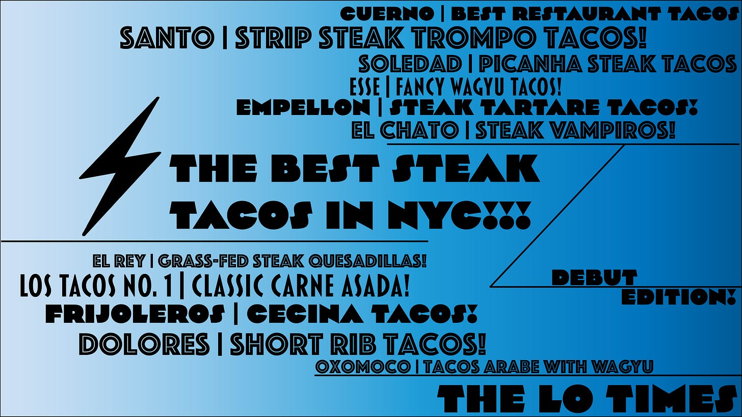 Please give a warm welcome to Steak Tacos, a long column that I’ve been plotting for quite some time!!! This is my third big beef guide, after The Steak List and The Budget Steak List.