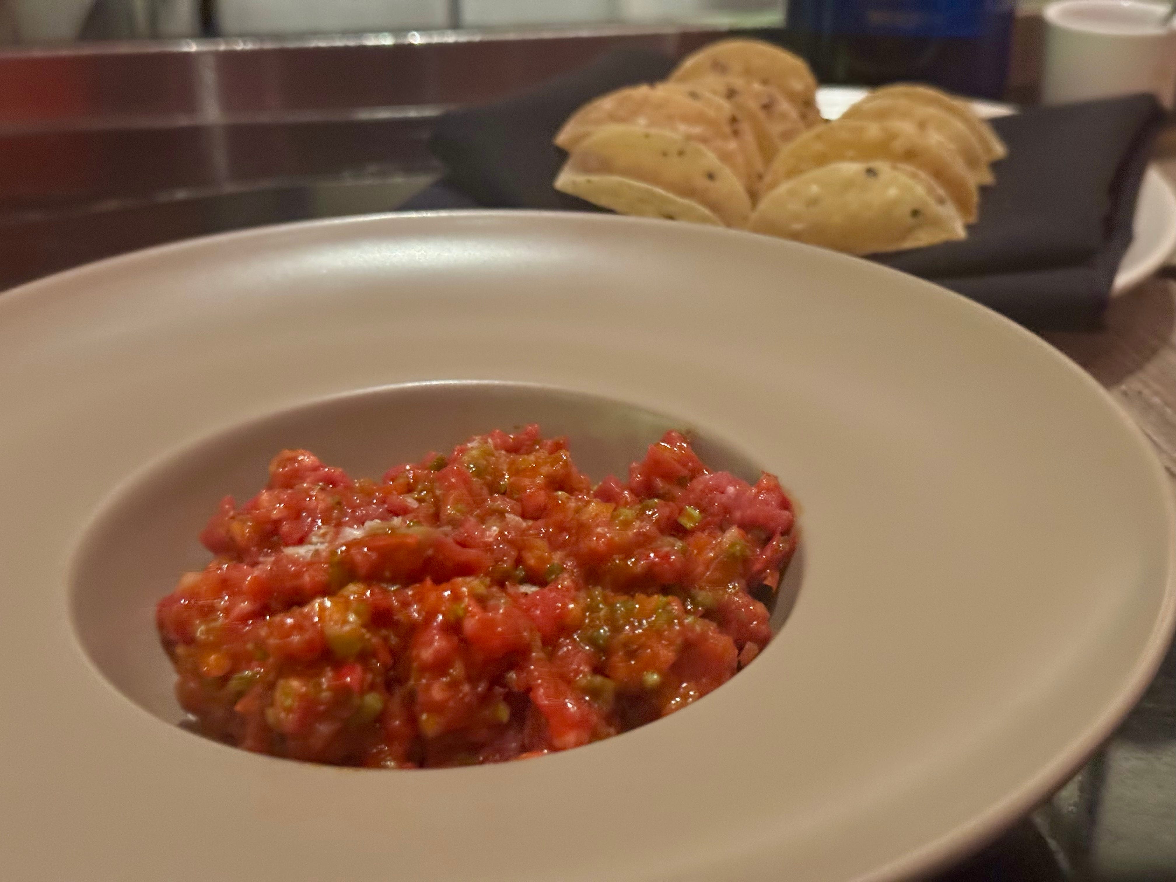 They’re miniature crisps. You use a tiny spoon to fill each one with cubes of crimson tartare. The shells are so small it’s as if you’re hosting a suburban taco night at your…local Barbie Dreamhouse. It’s hard not to imagine a little Ken Doll pretending to eat one at a plastic table.