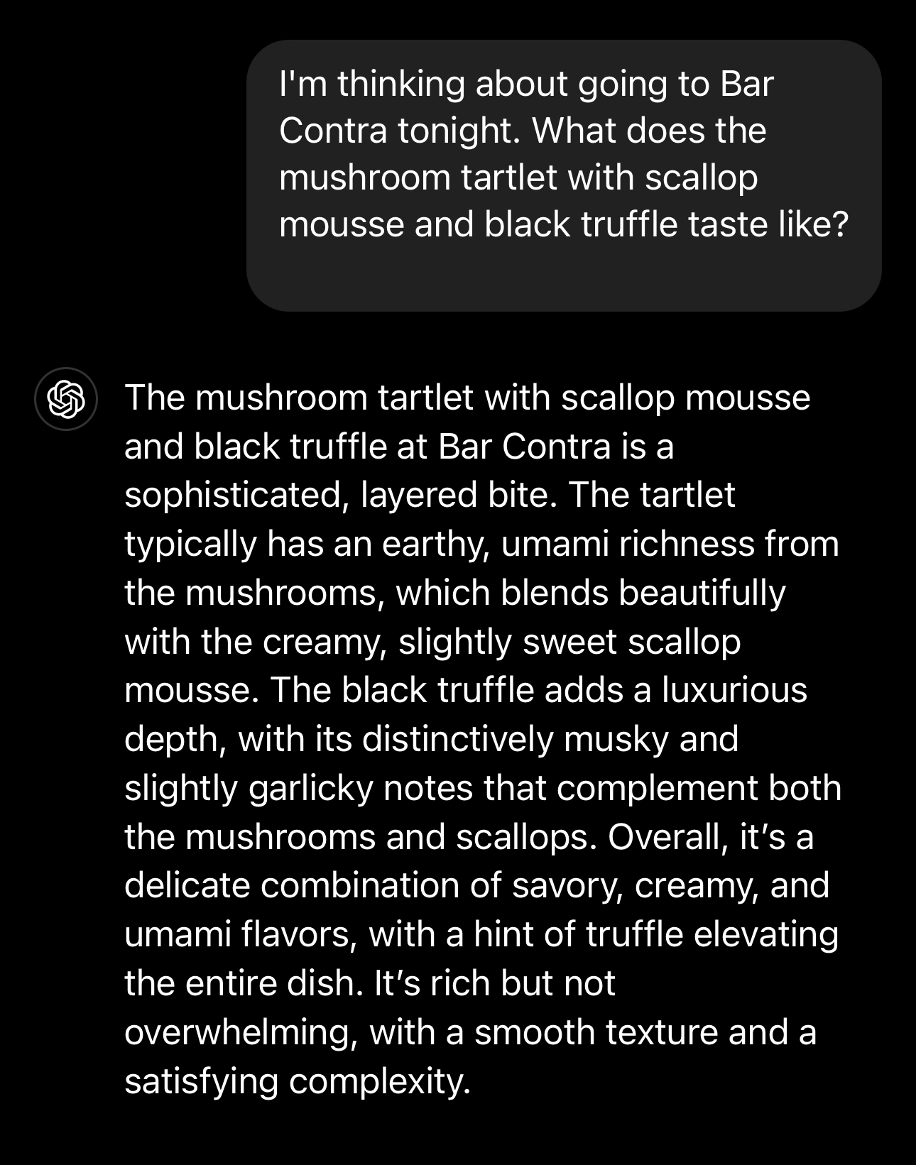 ChatGPT isn’t searching for what Yelp users, or critics, or social media folks are saying. It’s simply making up what something tastes like. To be fair, when I ask about a more famous dish, like Thomas Keller’s famed “oysters and pearls” — without offering any other context — the bot is smart enough to research all the components of the dish, including the caviar, oysters, and tapioca pearls.