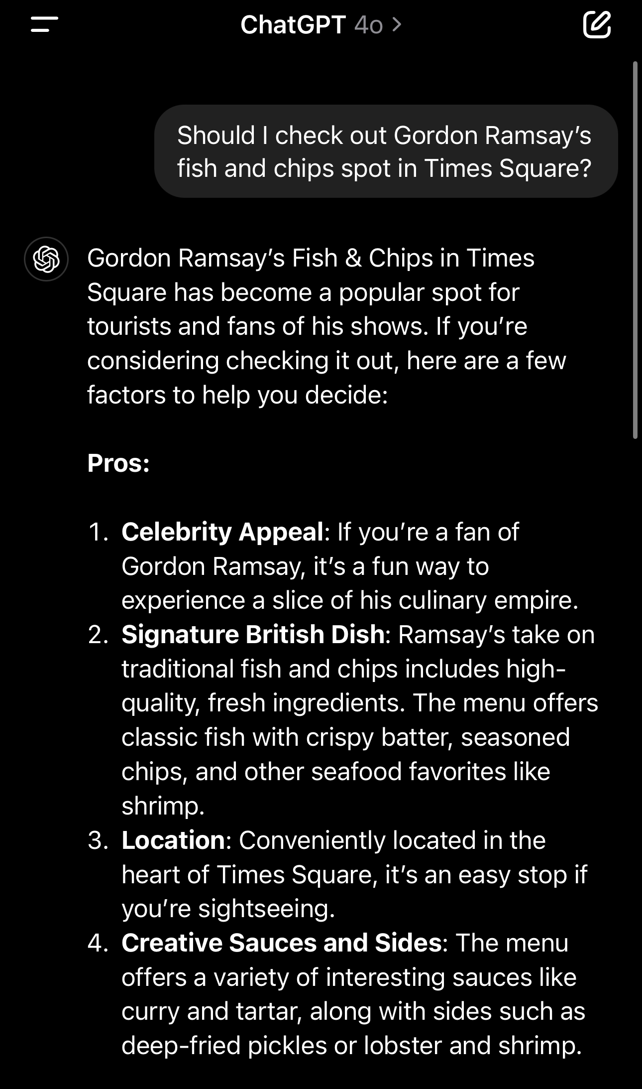 Let’s say you’re staying in Times Square. And you hear one of the world’s most famous chefs has a new restaurant. It’s called Gordon Ramsay Fish & Chips. If you ask ChatGPT about it, the answer is pretty clear: