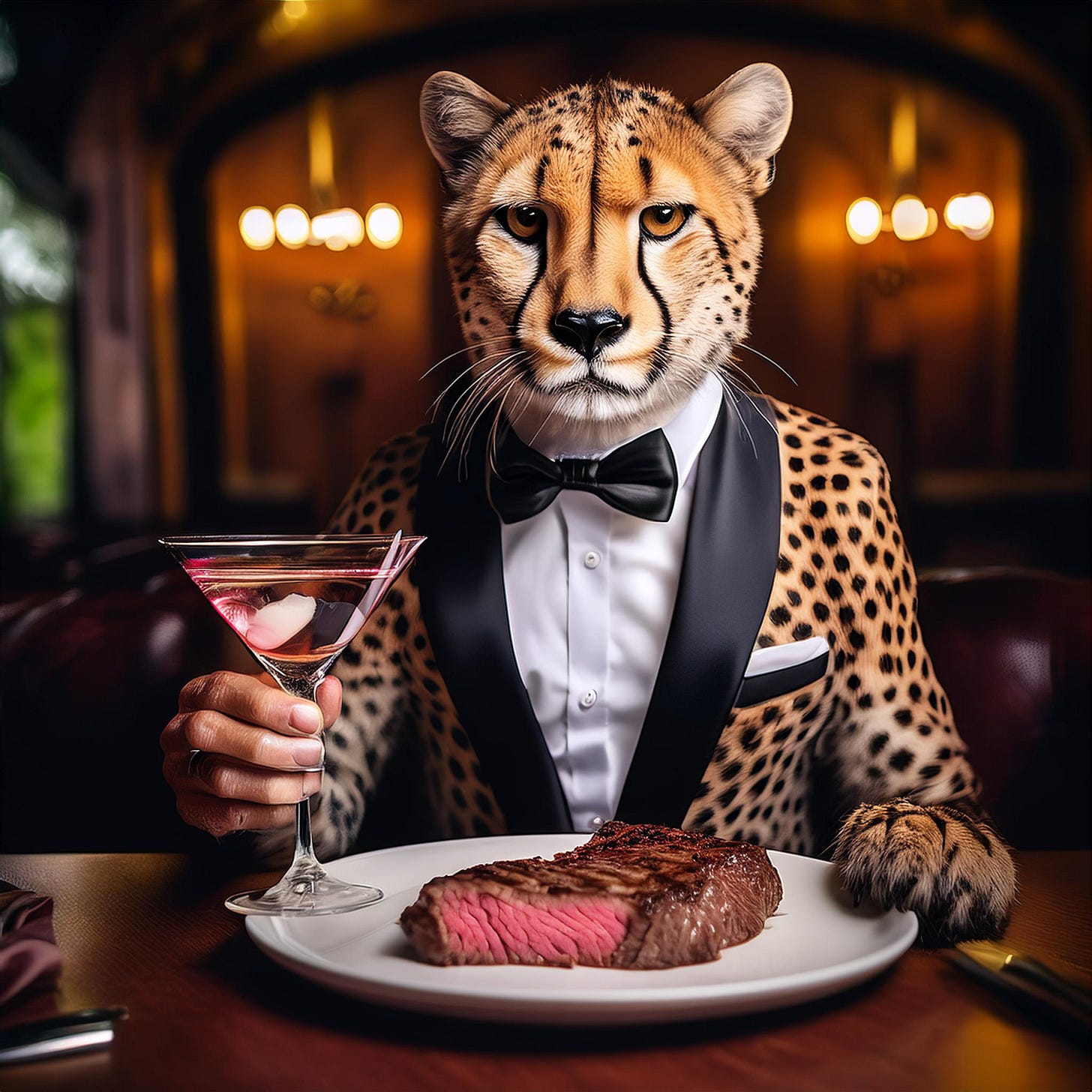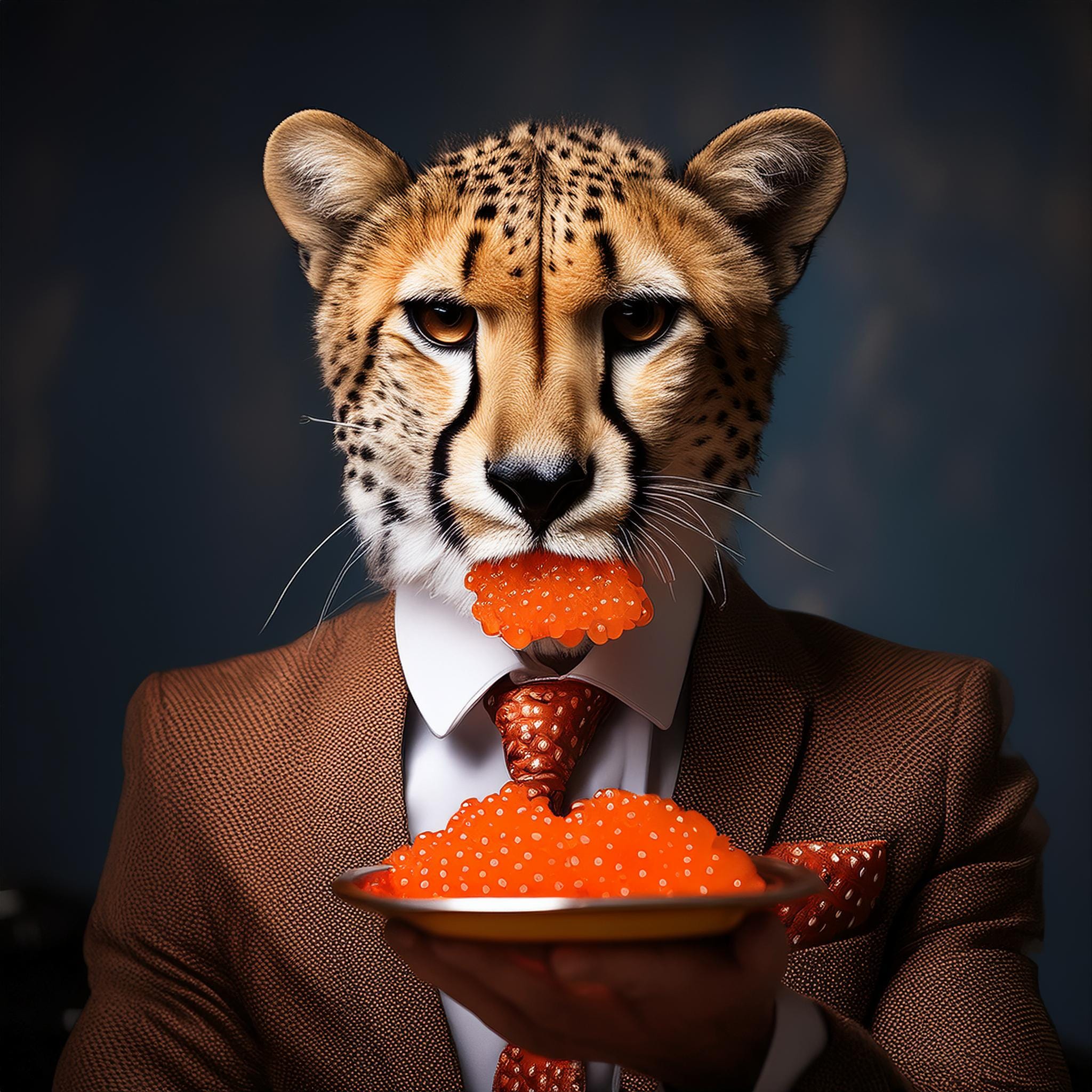 The cheetah in the lede pic somehow has one human hand and one animal paw, with a tuxedo that’s an extension of their body? And the steak looks as if it’s made of Play-Doh or hamburger meat. In the second photo, I asked for a cheetah in a suit eating salmon roe, and the result was….yikes. But what’s most troubling are the vacant faces of the subjects, with their ghastly, taxidermic stares.