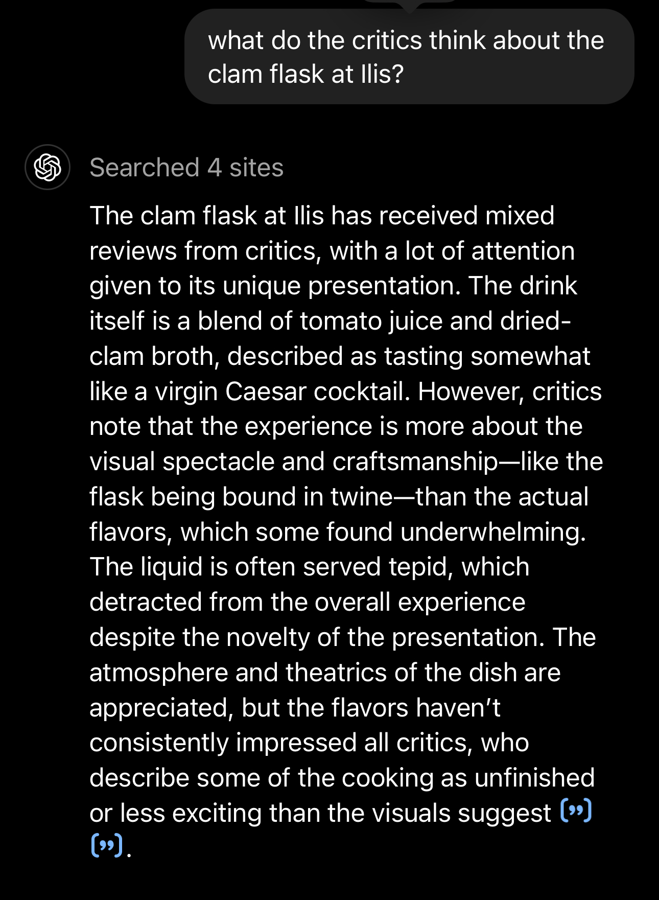 ChatGPT isn’t interested in quoting the writers. It aggregates their opinions into a single graph while ignoring their bylines — the word “tepid” is actually a direct lift from the Pete Wells review. So what was once nuanced criticism is now an anonymous commodity. And even though local media outlets collectively spent thousands of dollars on meals at Ilis for their paywalled reviews, the ChatGPT approach is to hide the names of the publications that funded these meals.